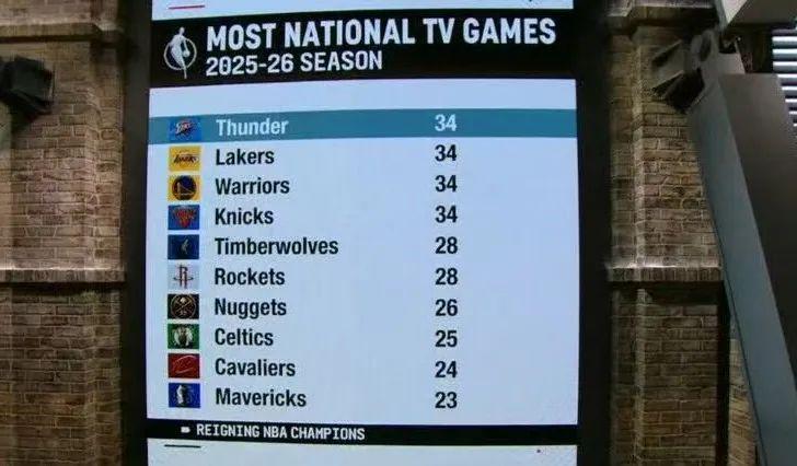 凭借34场全美直播,继续位居联盟第一